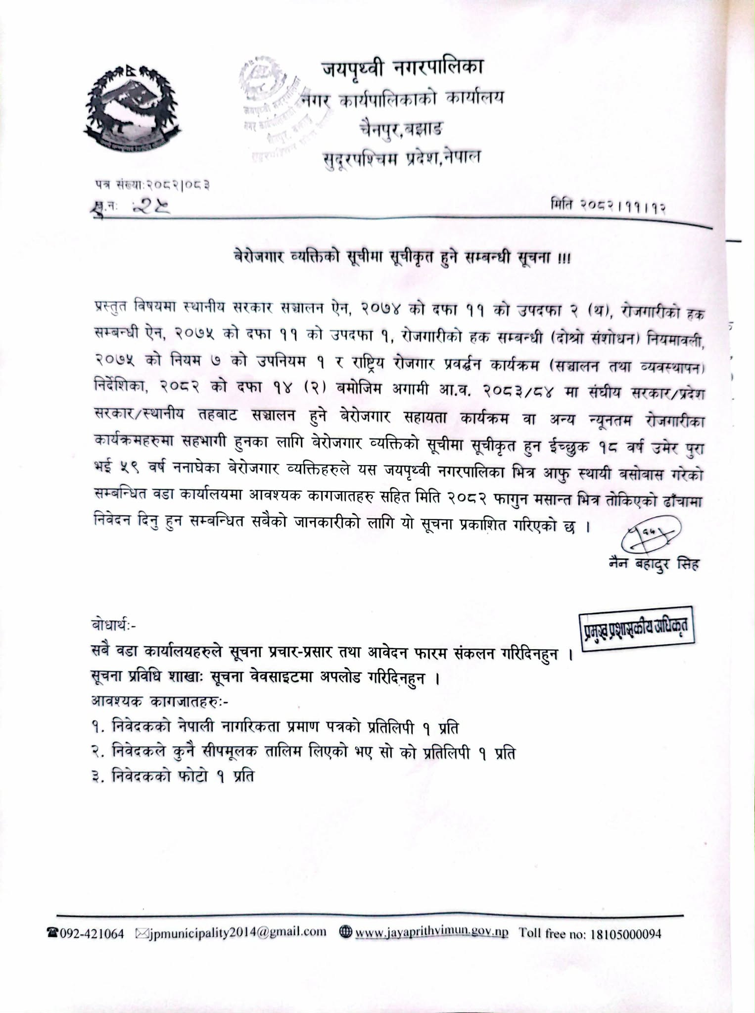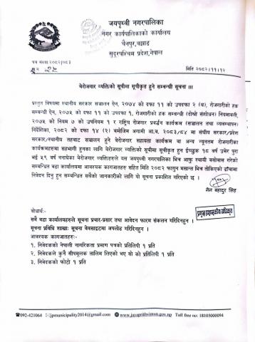 बेरोजगार व्यक्तिको सूचीमा सूचीकृत हुने सम्बन्धी जयपृथ्वी नगरपालिकाको सूचना !!!
