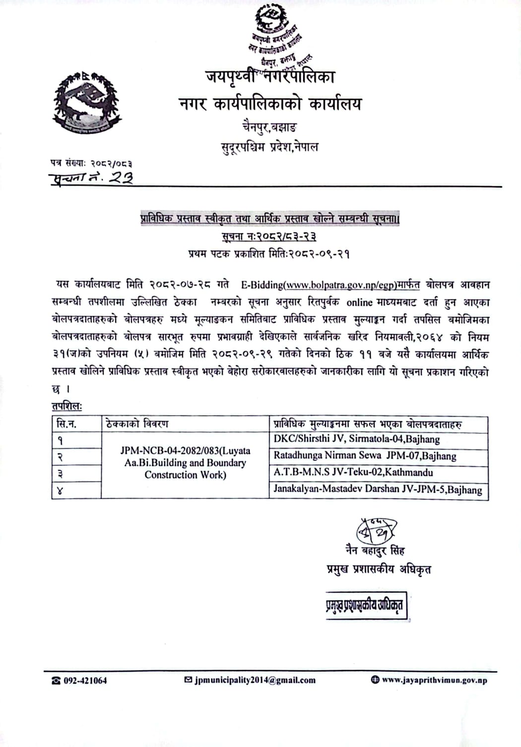 » आर्थिक प्रस्ताव खोलिने सम्बन्धि जयपृथ्वी नगरपालिकाको सूचना !!!