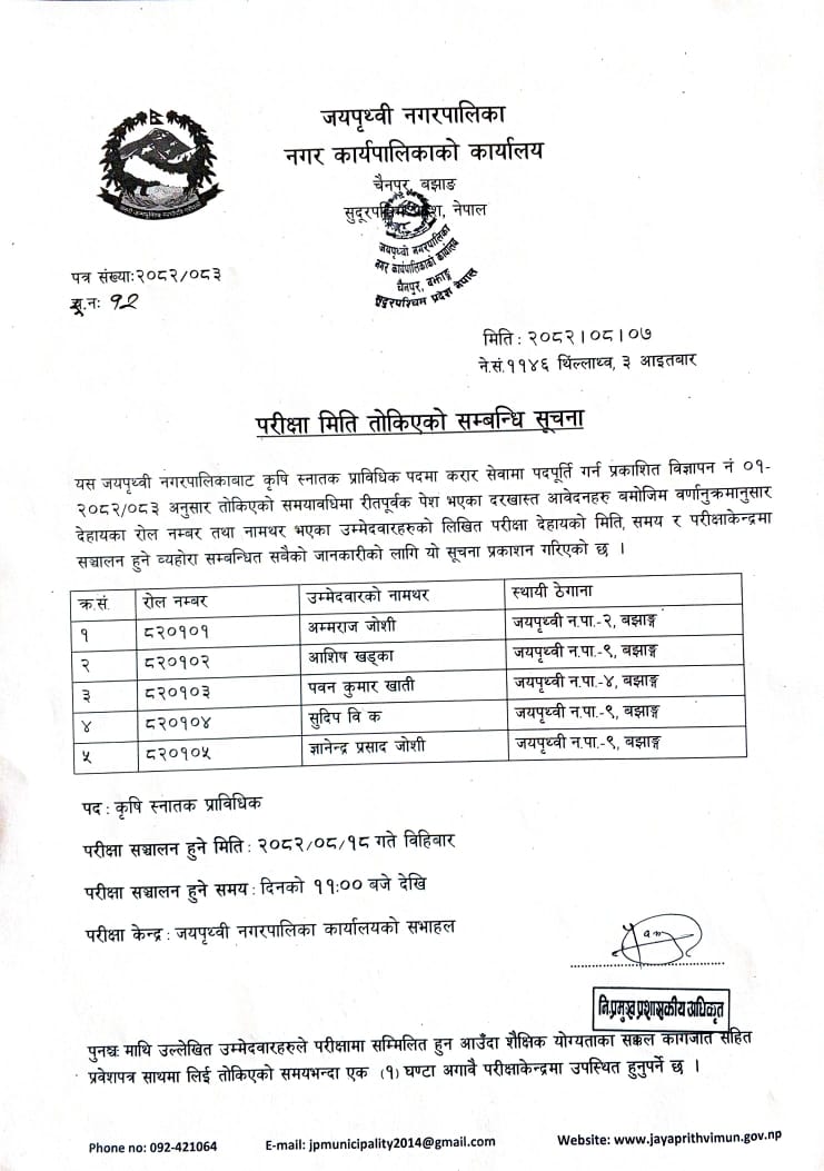 कृषि स्नातक प्राविधिक पदको परीक्षा तोकिएको बारे जयपृथ्वी नगरपालिको सूचना