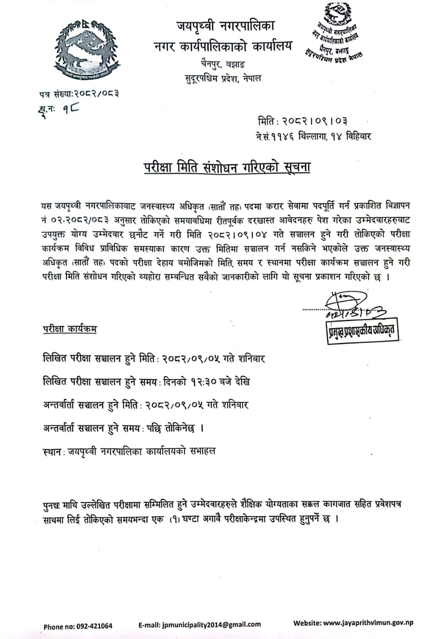 परीक्षाको मिति संसोधन गरिएको बारे जयपृथ्वी नगरपालिकाको सूचना !!!