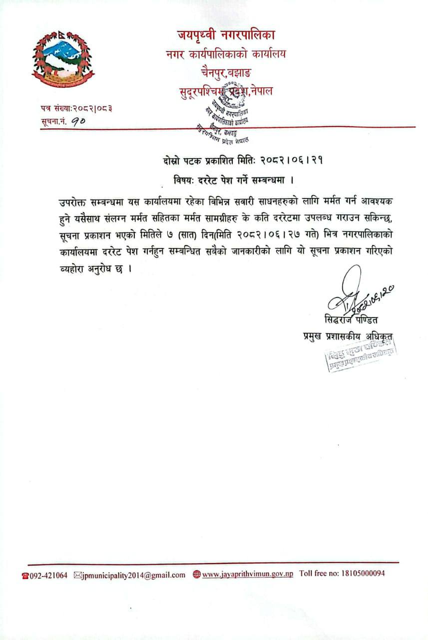 कर्मचारी आवश्यकता सम्बन्धि जयपृथ्वी नगरपालिकाको सूचना !!!