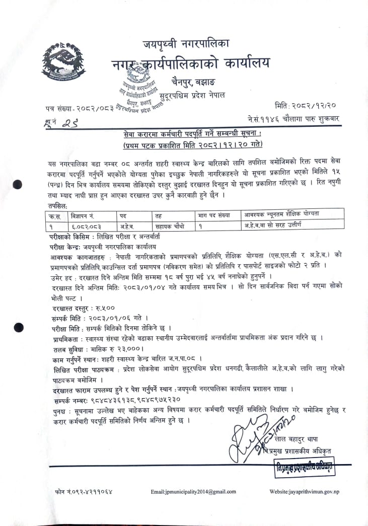 सेवा करारमा कर्मचारी पदपुर्ती सम्बन्धी जयपृथ्वी नगरपालिकाको सूचना !!!