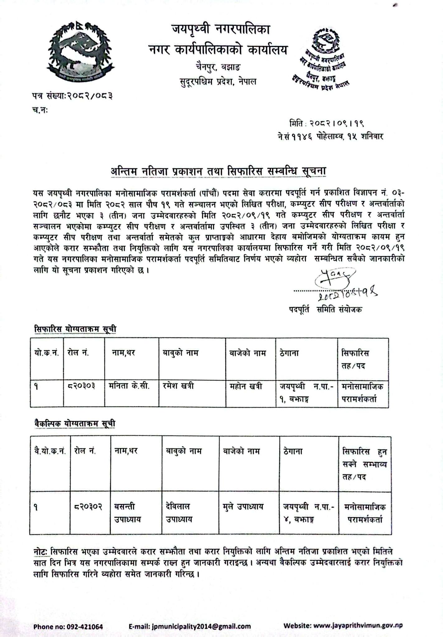 मनोसामाजिक परामर्शकर्ताको अन्तिम नतिजा प्रकाशन सम्बन्धमा जयपृथ्वी नगरपालिकाको सूचना !!!