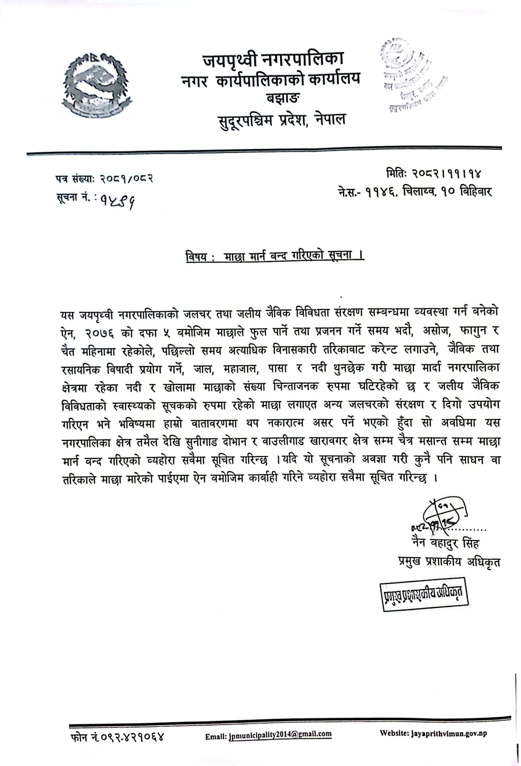 माछा मार्न बन्द गरिएको बारे जयपृथ्वी नगरपालिकाको सूचना !!!