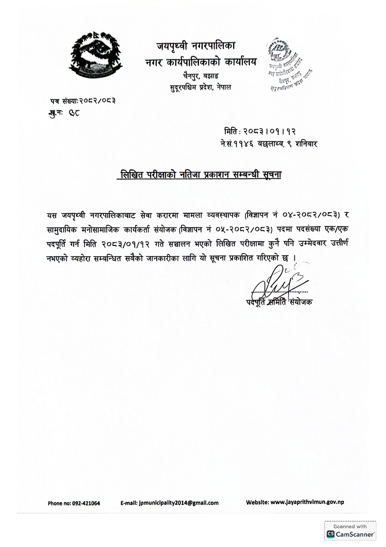 मामला व्यवस्थापक पद र सामुदायिक मनोसामाजिक कार्यकर्ता पदको नतिजा प्रकाशन गरिएको बारे जयपृथ्वी नगरपालिकाको सूचना !!!